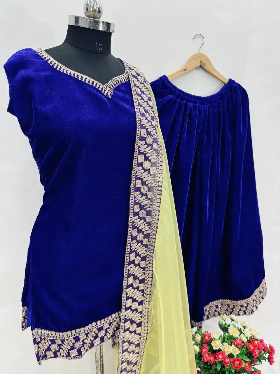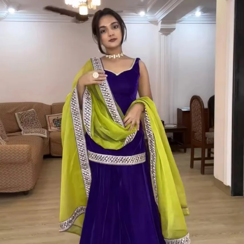 Indian Heavy Designer Viscose Velvet Chine Stitch Embroidered Work Top Pant with Fancy Lace Border Dupatta for Winter Party Wear